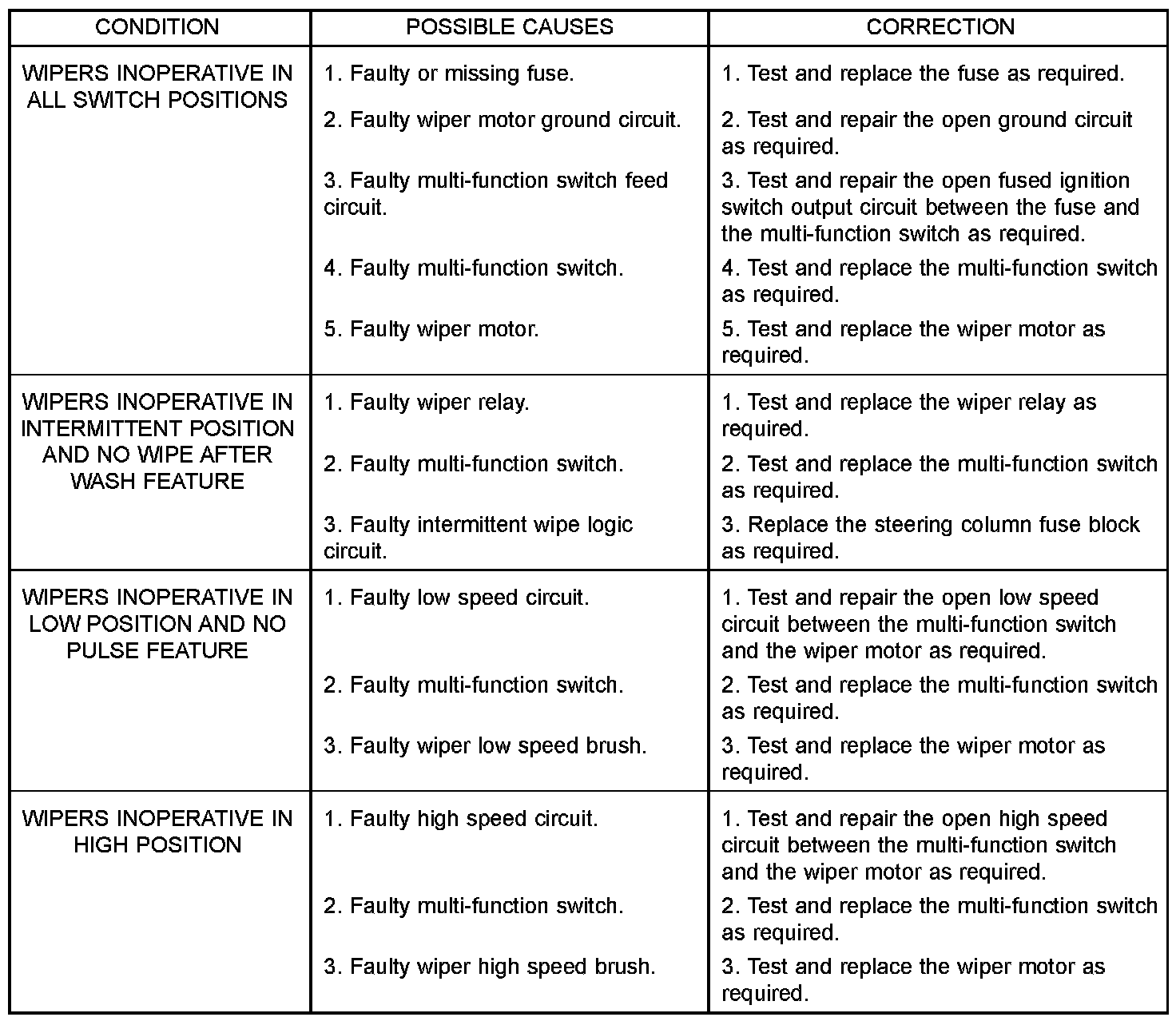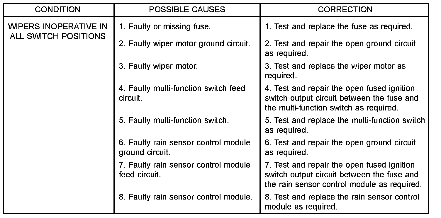 If the wiper motor operates, but the wipers do not move on the windshield, replace the faulty wiper linkage module. If the washer pump/motor operates, but no washer fluid is dispensed on the glass; or, if the wipers operate, but chatter, lift, or do not clear the glass, clean and inspect the wiper and washer system components as required. For diagnosis and testing of the multi-function switch Refer to the appropriate wiring information. The wiring information includes wiring diagrams, proper wire and connector repair procedures, details of wire harness routing and retention, connector pin-out information and location views for the various wire harness connectors, splices and grounds.The hard wired circuits and components of the wiper and washer system may be diagnosed and tested using conventional diagnostic tools and procedures. However, conventional diagnostic methods may not prove conclusive in the diagnosis of the intermittent wipe logic circuitry contained within the fuse block underneath the steering column, the rain sensor within the base of the rear view mirror on the windshield, or the rain sensor control module under the instrument panel.