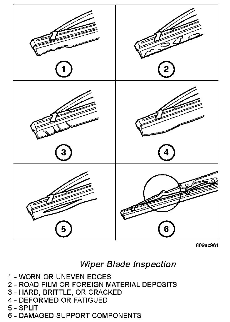 The wiper blades and wiper arms should be inspected periodically, not just when wiper performance problems are experienced. This inspection should include the following points: