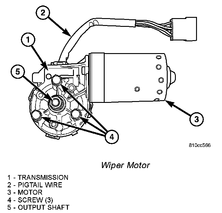 The wiper motor is secured with three screws to a motor bracket integral to the wiper linkage module bracket located below the cowl top panel in the engine compartment. The wiper motor output shaft passes through a hole in the motor bracket, where a nut secures the wiper motor crank arm to the motor output shaft. The two-speed permanent magnet wiper motor features an integral transmission, an internal park switch, and an internal Positive Temperature Coefficient (PTC) circuit breaker.