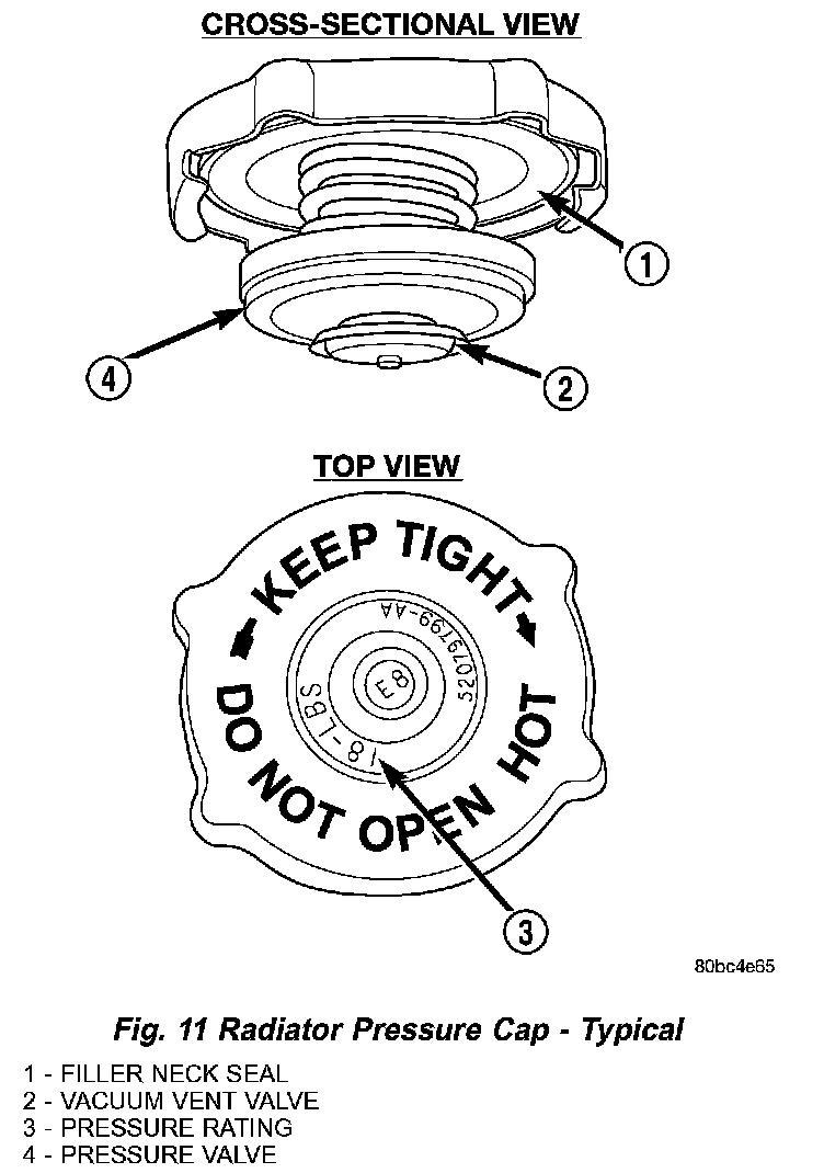 All vehicles are equipped with a pressure cap (Fig. 11). This cap releases pressure at some point within a range of 124 - 145 kPa (18 - 21 psi). The pressure relief point (in pounds) is engraved on top of the cap