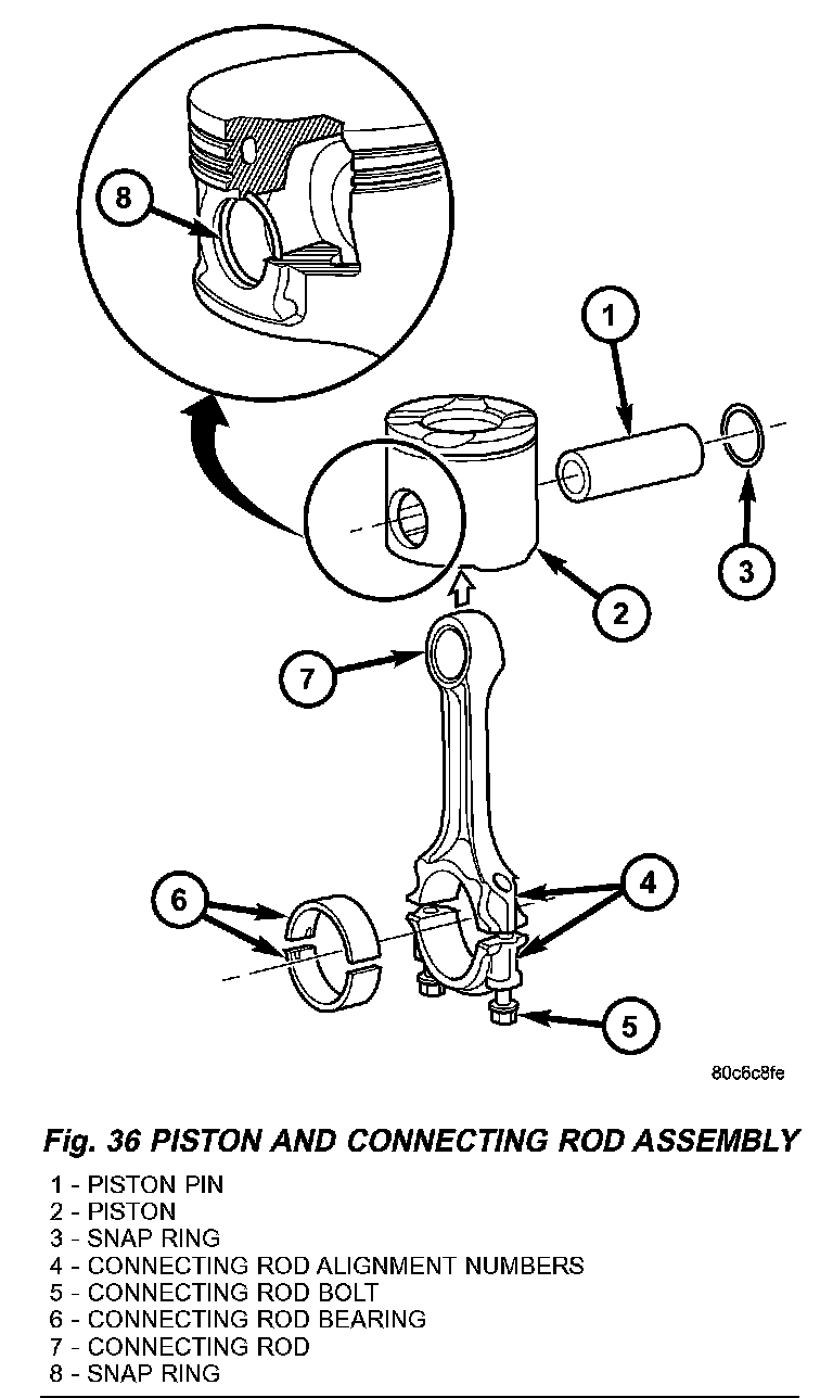 The pistons are of a free floating design and made of optimized aluminum alloy with a graphite coated bearing surface. The crown of the piston has been designed to accommodate higher injection pressures. Oil jets in the engine block lubricate and cool the piston and pin assembly. The connecting rods have a pressed in place wrist pin bushing featuring specially adjusted lubrication grooves which are lubricated by the oil jets (Fig. 36). The steel connecting rods feature a small end of trapezoidal shape and a cracked large end.