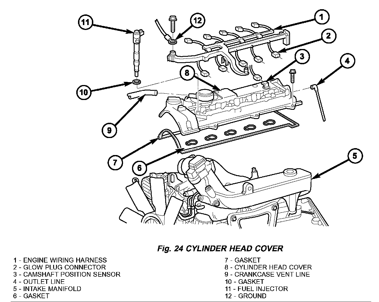 1. Fit cylinder head cover with new gasket and install bolts, hand tight (Fig. 24).