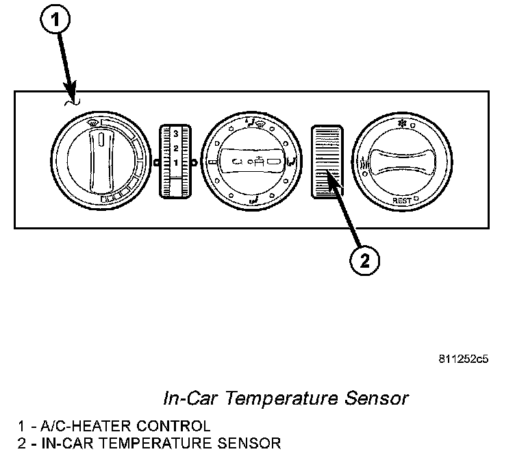 The in-car temperature sensor measures the actual air temperature within the passenger compartment. The in-car temperature sensor is located inside of the A/C-heater control behind a vented panel and is not a separate serviceable component. The A/C-heater control must be replaced if there is a fault relating to the in-car temperature sensor.
