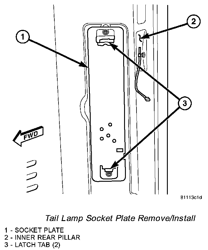 3. From inside the vehicle, use hand pressure to push the two latch tabs toward the center of the tail lamp unit socket plate and pull the socket plate straight out from the inner rear pillar.