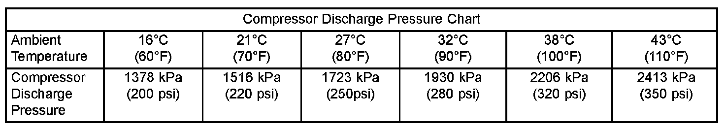 11. Record the compressor discharge pressure. If the reading is higher than the pressure shown in the Compressor Discharge Pressure Chart, the system could be overcharged. If the reading is equal to, or lower, than the pressure shown in the chart, continue with this procedure.