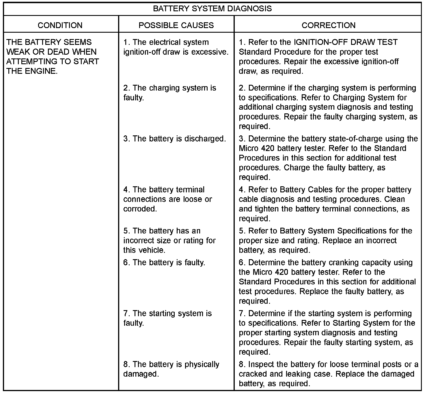 The following information details the recommended inspection procedures for the battery and related components. In addition to the maintenance schedules found in this and the owner's manual, it is recommended that these procedures be performed any time the battery or related components must be removed for vehicle service.