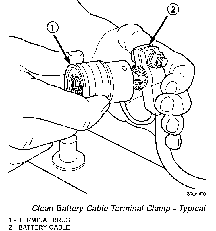 1. Clean the battery cable terminal clamps of all corrosion. Remove any corrosion using a wire brush or a post and terminal cleaning tool, and a sodium bicarbonate (baking soda) and warm water cleaning solution.