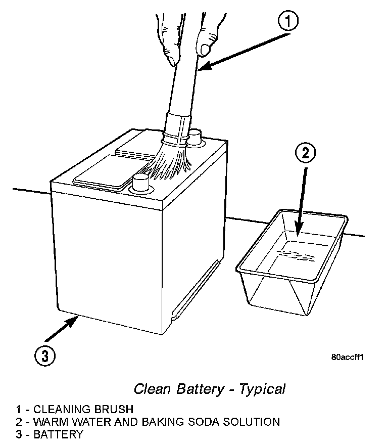 4. If the vehicle is so equipped, clean the battery thermal guard with a sodium bicarbonate (baking soda) and warm water cleaning solution using a stiff bristle parts cleaning brush to remove any acid film.