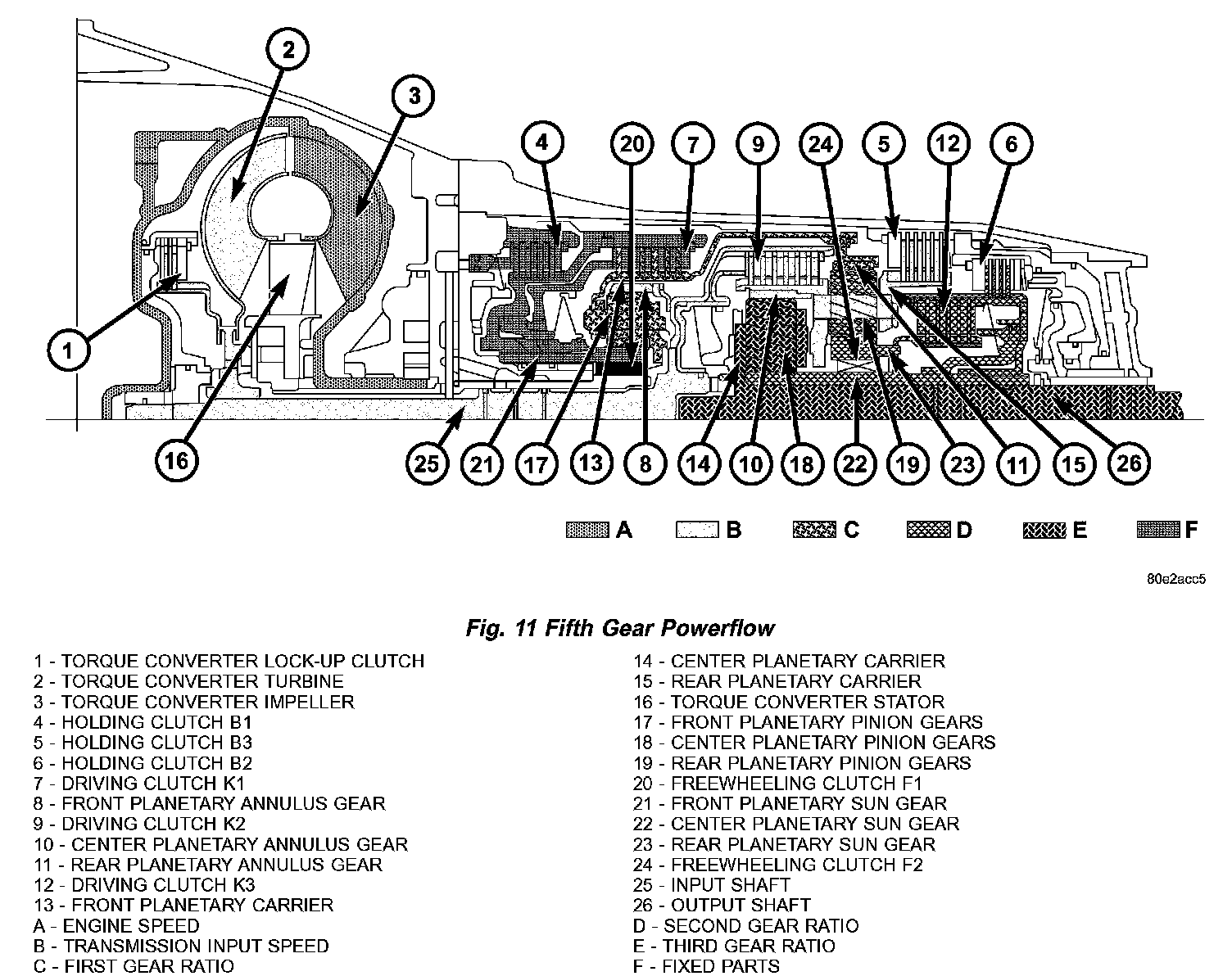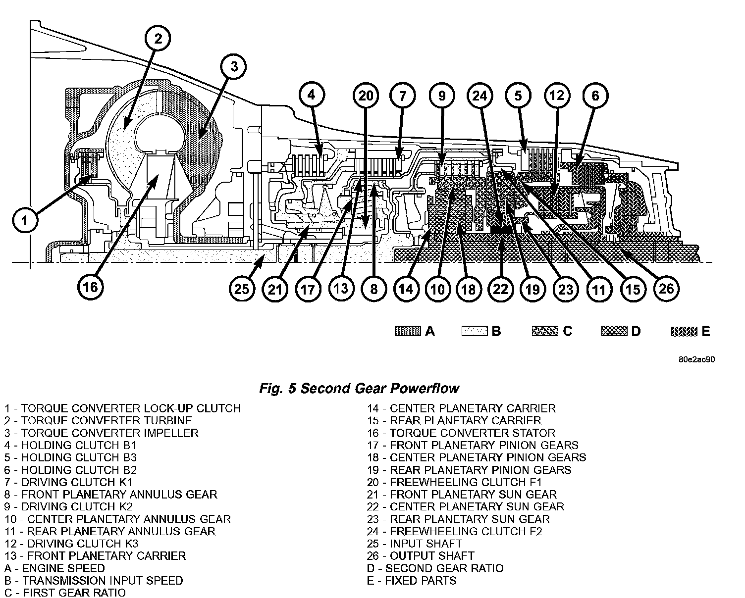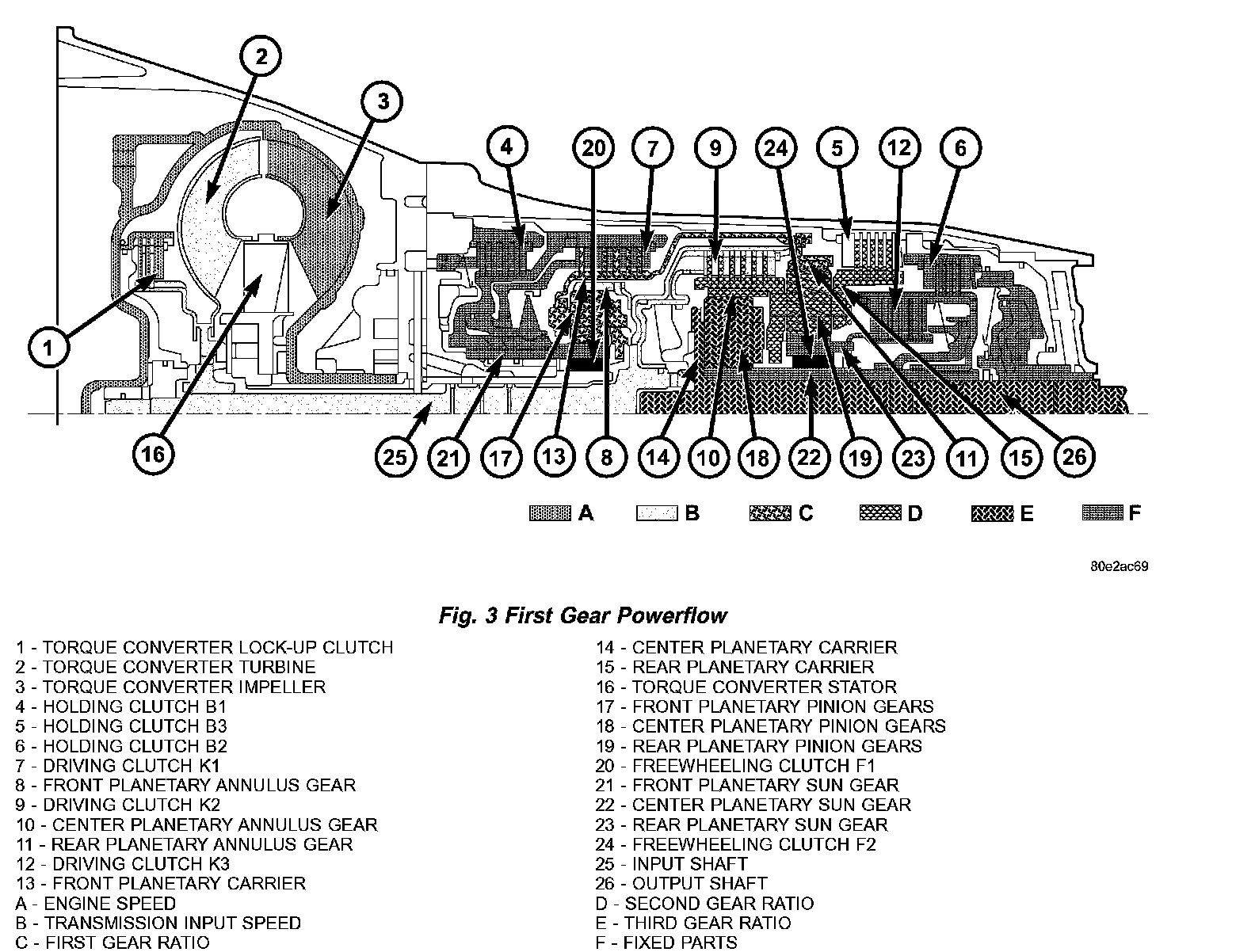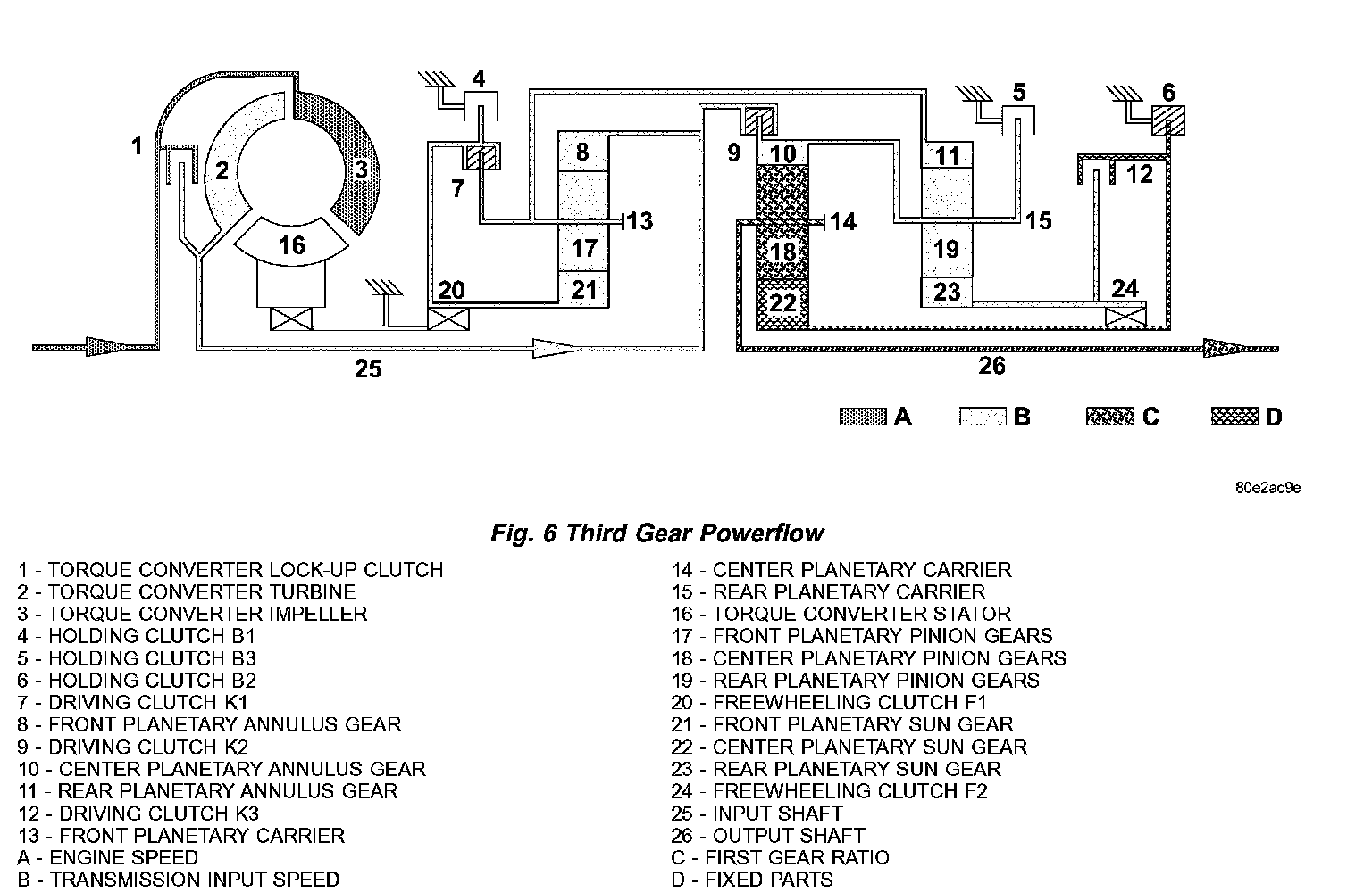 Torque from the torque converter is increased via the input shaft (25) and the center and rear planetary gearset and transferred to the output shaft (26) (Fig. 4) (Fig. 5)