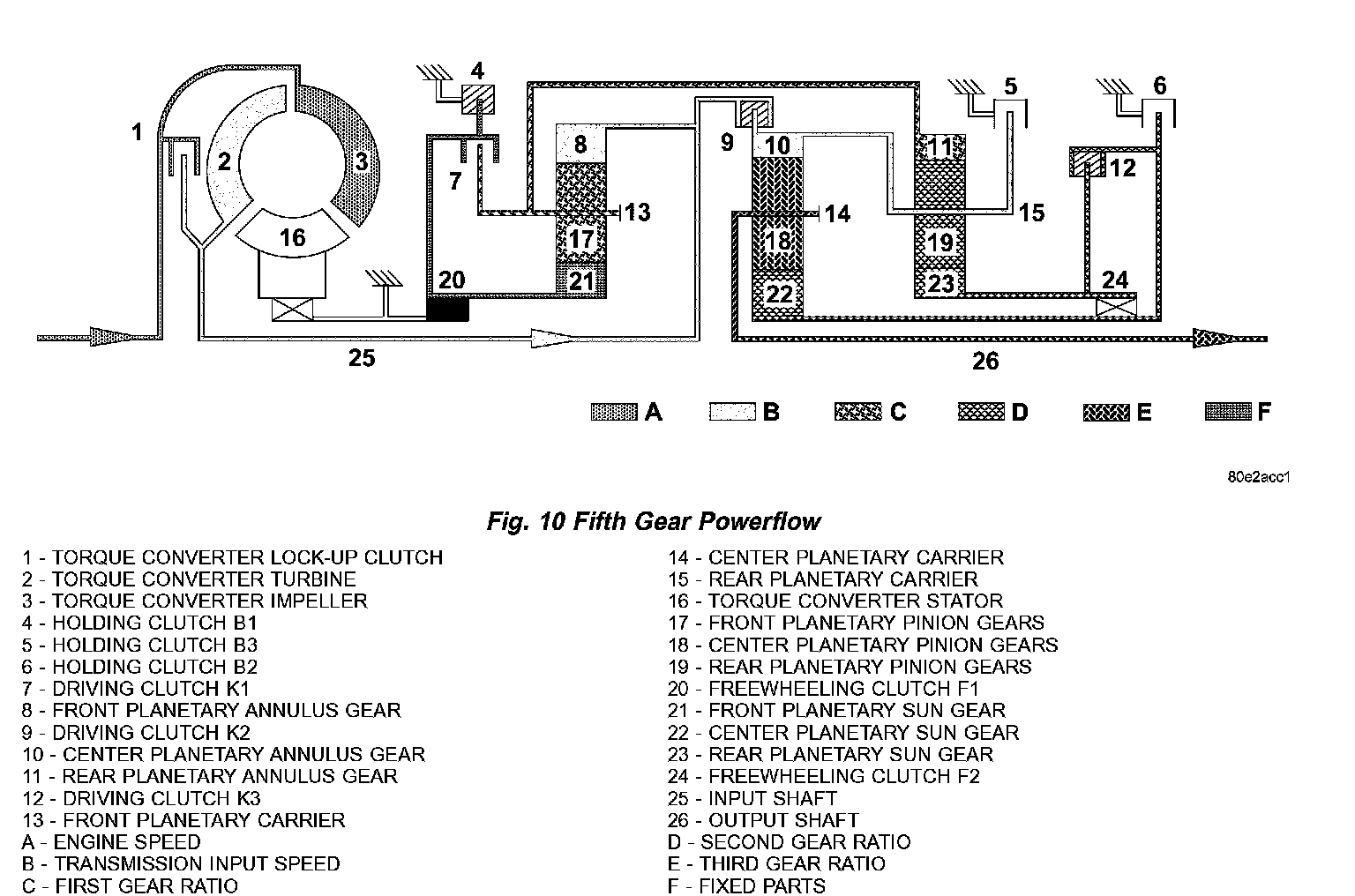 Torque from the torque converter is increased via the input shaft (25) and all three planetary gearsets and transferred to the output shaft (26). (Fig. 10) (Fig. 11)