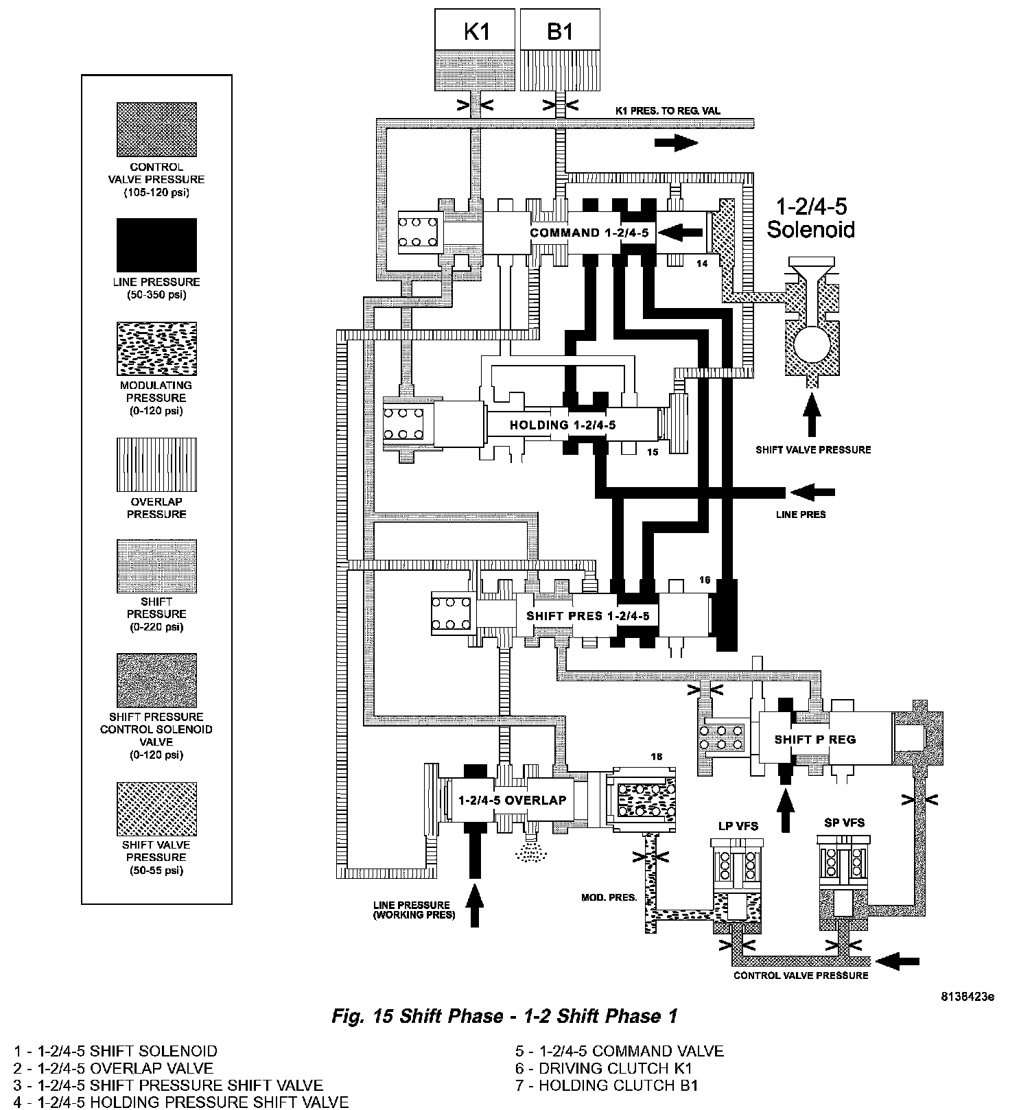 The 1-2/4 5 shift solenoid (1) (Fig. 18) is turned ON to apply shift pressure (p-S) to the end face of the 1 2/4 5 command valve (5). This allows the command valve to up shift and the shift pressure coming from the 1 2/4 5 shift valve (3) is routed to the holding clutch B1 (7) via the command valve.