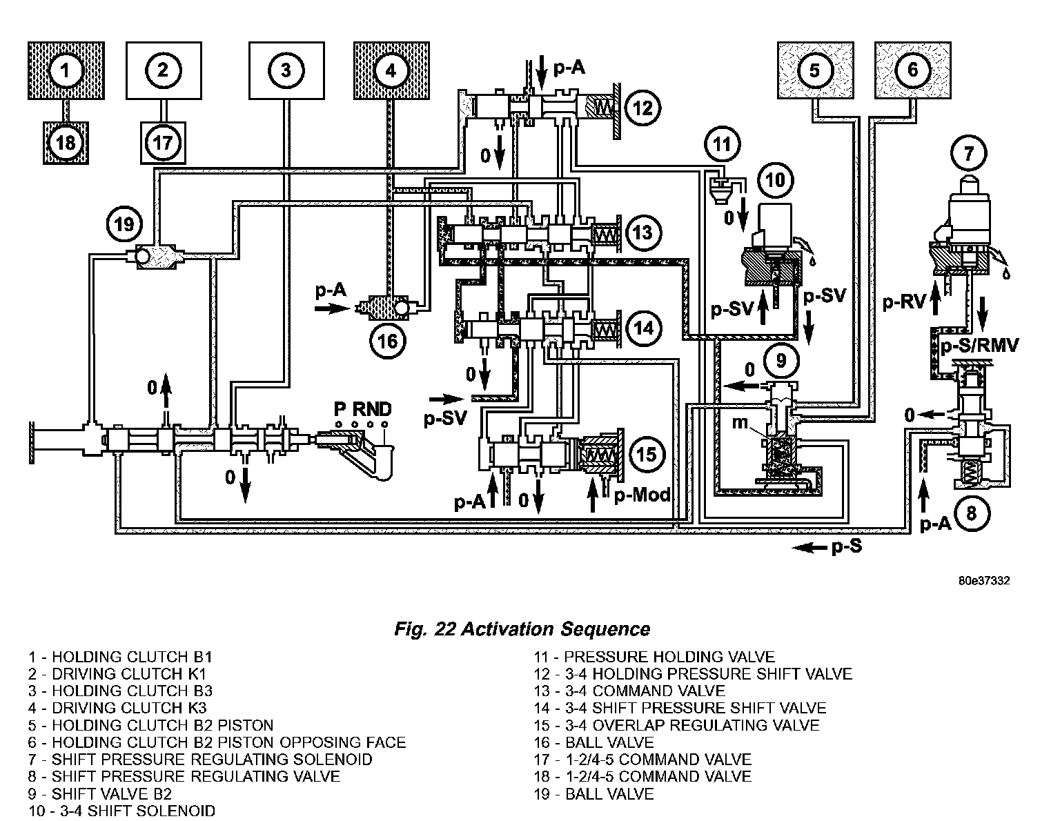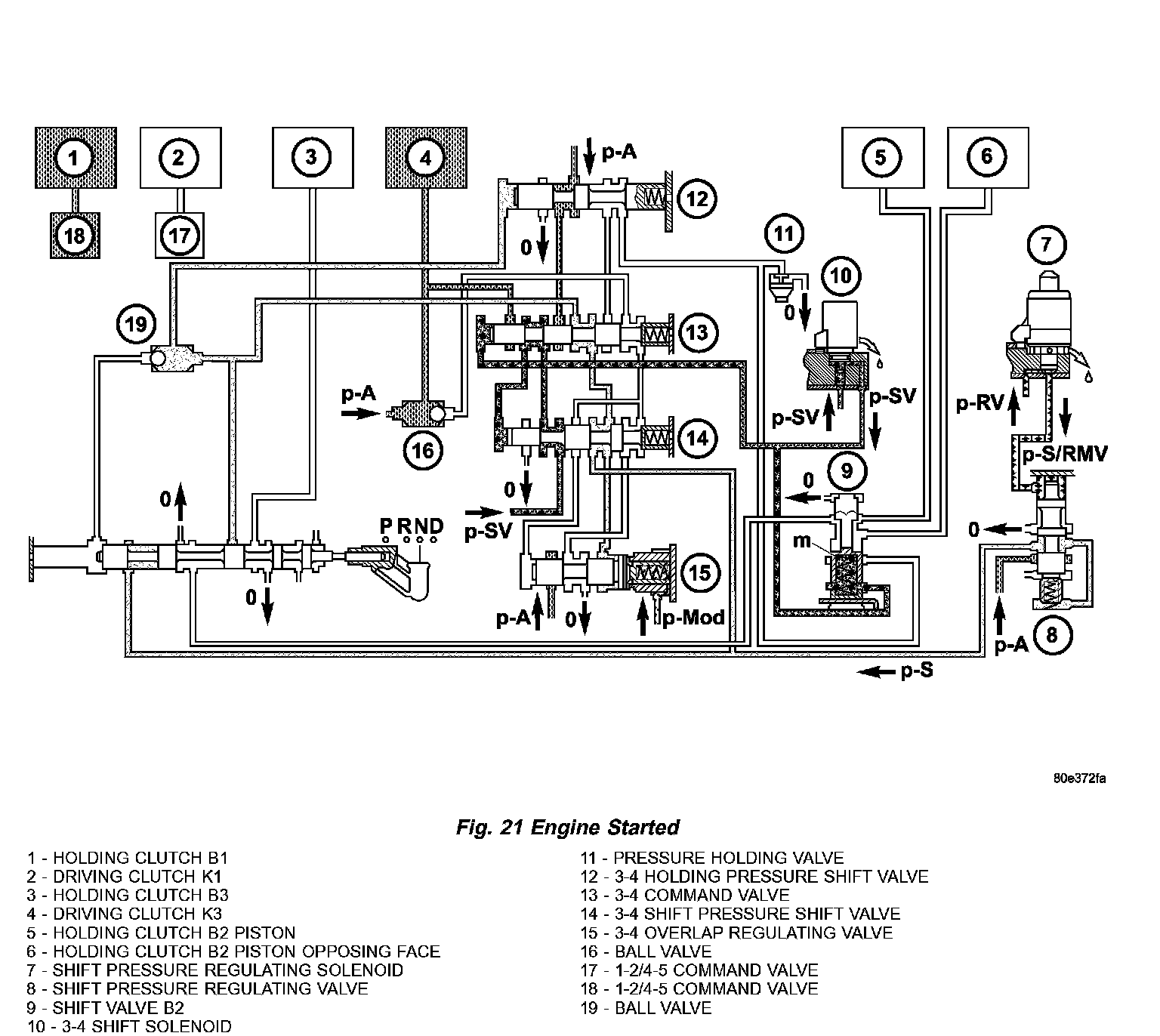 The pressure in clutch B1 (7) (Fig. 19) acting on the end face of the 1 2/4 5 holding valve (4) forces the valve to up shift against the spring pressure and allows line pressure (p-A) to pass through the command valve (5).