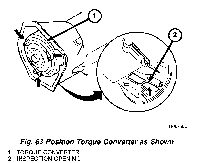 3. Move the torque converter (1) (Fig. 63) to shown position. Check position of torque converter through housing opening (2) when installing transmission.