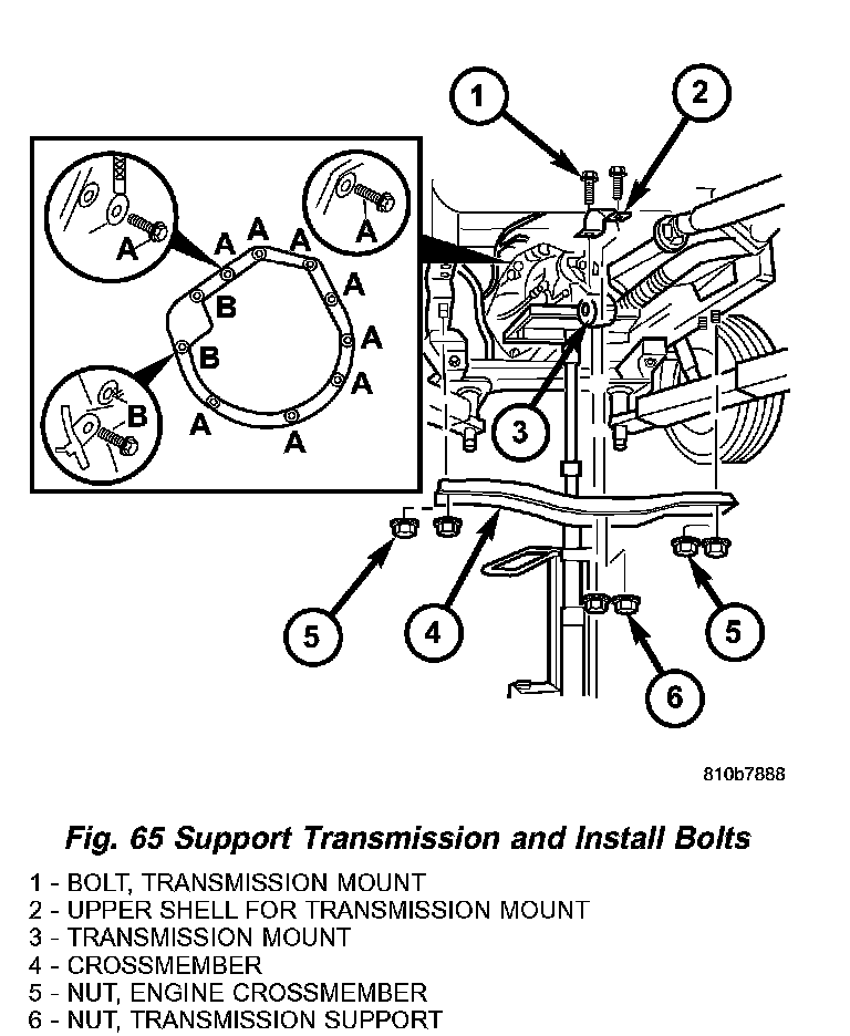 7. Move the transmission into position on the dowel pins and install two bolts (A, B) (Fig. 65) on the top of the transmission. Torque the bolts to 38 Nm (28 ft. lbs.).