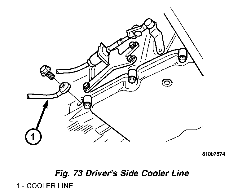 c. Install the bolts to hold the oil cooler lines (6) to the left (Fig. 73) and right sides of transmission. Torque the bolts to 34 Nm (254 ft. lbs.).