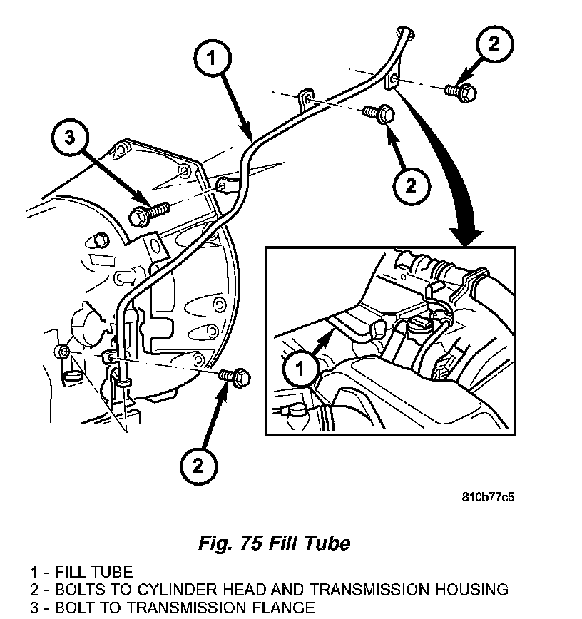 b. Push lower connection of oil filler pipe (1) (Fig. 75) into the fill hole in the side of the transmission housing.