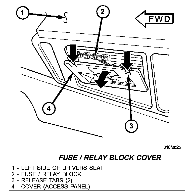 1. Remove Fuse/Relay Block cover by pushing down on two tabs located at top of cover.