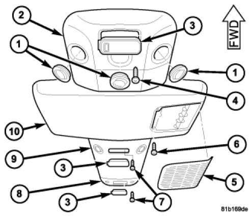 5. Install the front, center and rear roof duct trim panels (2, 9 and 8) and retaining screws (4 and 7). Tighten the screws to 2 Nm (17 in. lbs.).