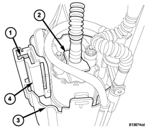 5. To remove sending unit from pump module, press on plastic locking tabs (1) while sliding sending unit (4) on its tracks.