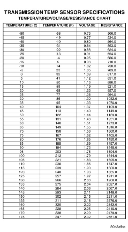 Refer to the Transmission Temperature Sensor Specifications table for the relationship between transmission temperature, sensor voltage, and sensor resistance.