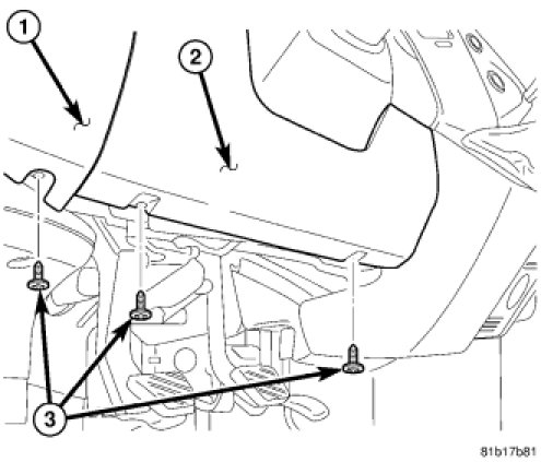 6. Install the screws (3) and the lower steering column opening cover (2), and the side cover (1).