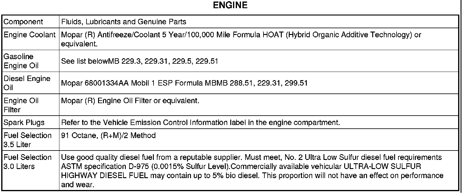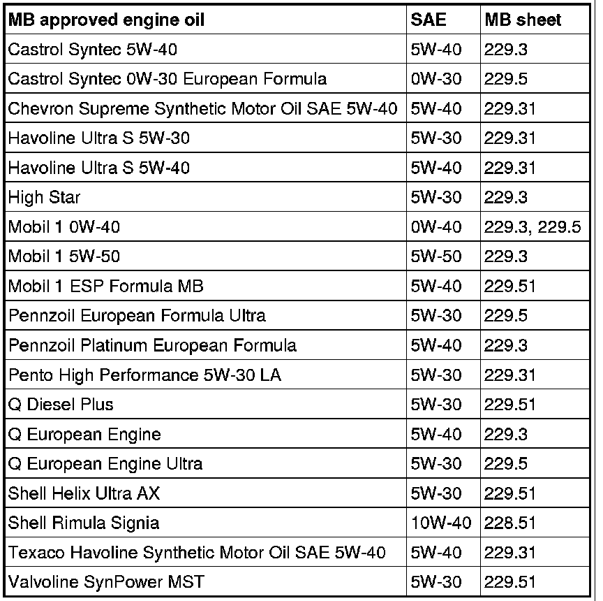 The following oils have been determined to meet the DaimlerChrysler requirements as shown below: