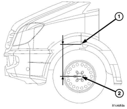 To check front curb height measure the distance between the wheel center (2) and the wheel well housing (1) which should be between the given specifications.