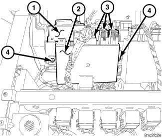6. Reposition the module mounting strip (1) within the seat riser for easiest access to the two screws (4) that secure the TM to the mounting strip.