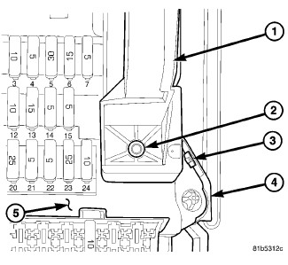 2. Insert the two posts integral to the upper edge of the fuse/relay block #1 (5) into the holes in the upper end of the mounting bracket behind the instrument panel.