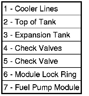 The fuel pump module is installed in the top of the fuel tank. The pump module contains the following components:
