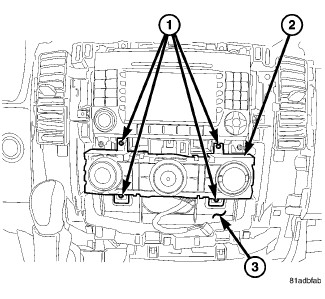 5. Install the four screws (1) that secure the A/C-heater control to the instrument panel. Tighten the screws to 2 Nm (17 in. lbs.).