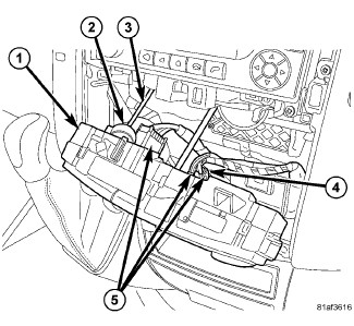 2. Connect the wire harness connectors (5) to the back of the A/C-heater control (1) and engage the connector lock (4). Make sure the connector lock is fully engaged.