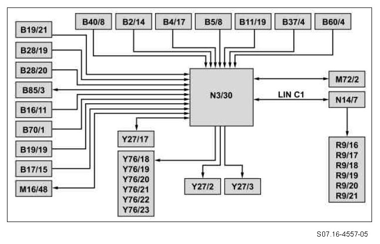 - via the engine compartment-CAN (CAN C) from the EZS control unit (N73) the signal from the outside air temperature sensor (B14) from the SAM control unit (N10) via the interior CAN (CAN B)