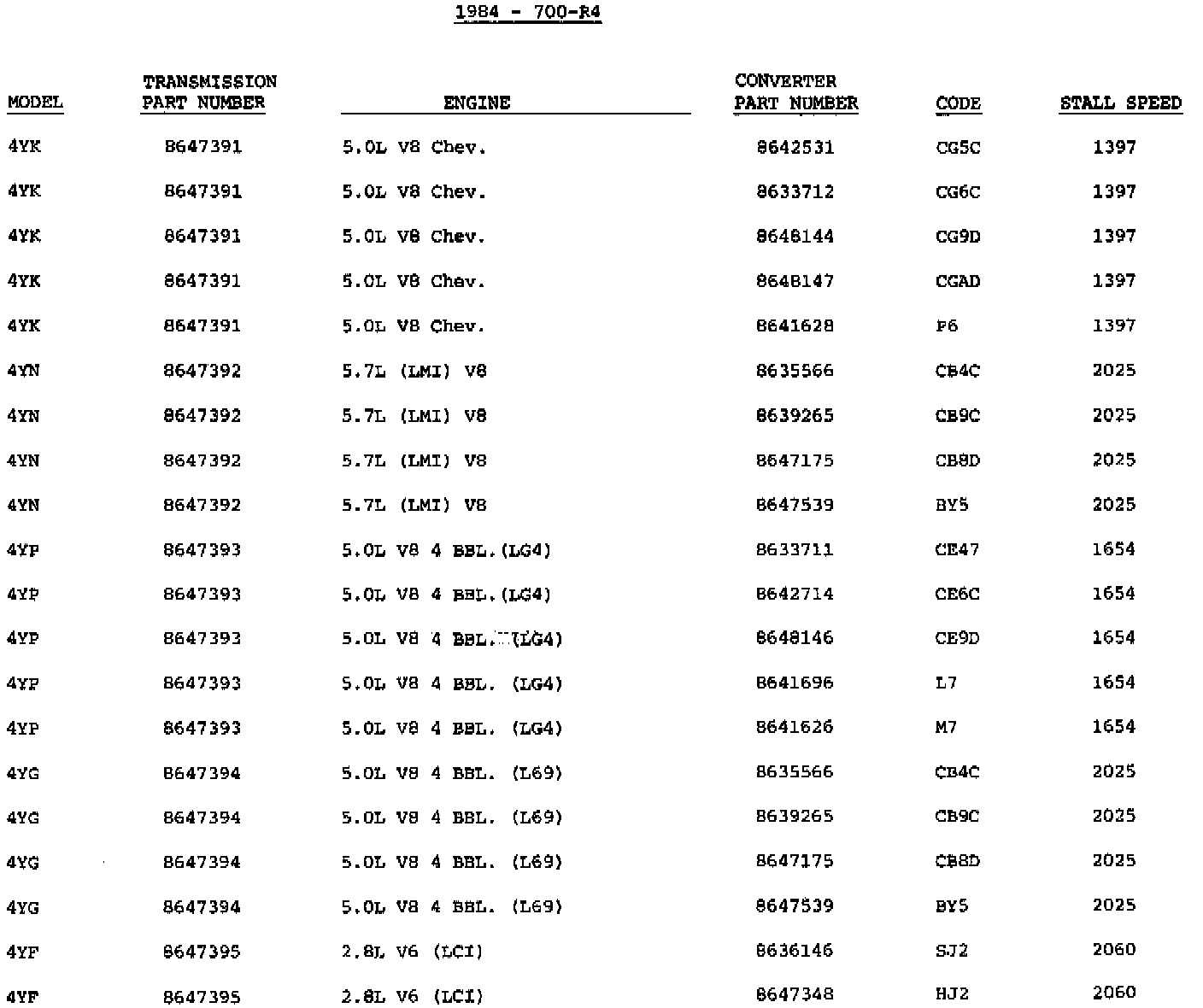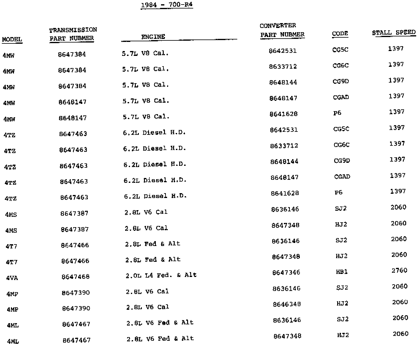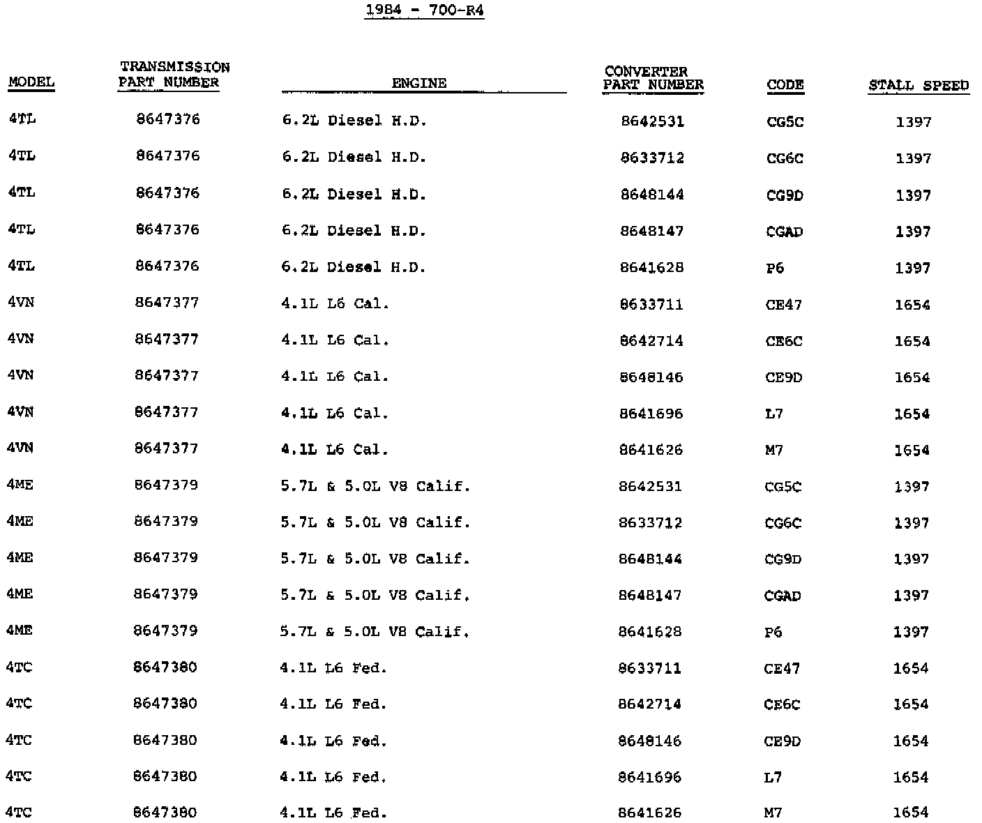 The following information is provided for 1984 model transmissions. It will enable you to identify some models and converter usage.