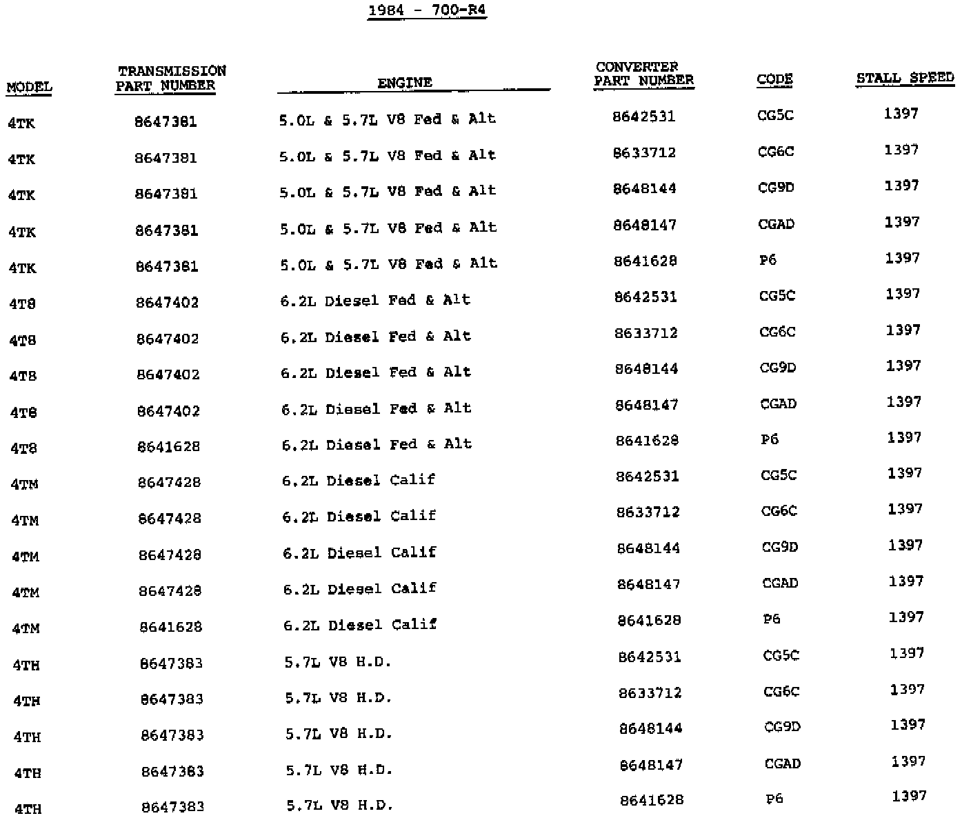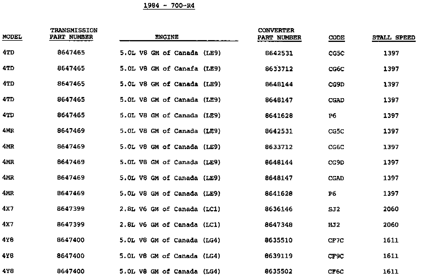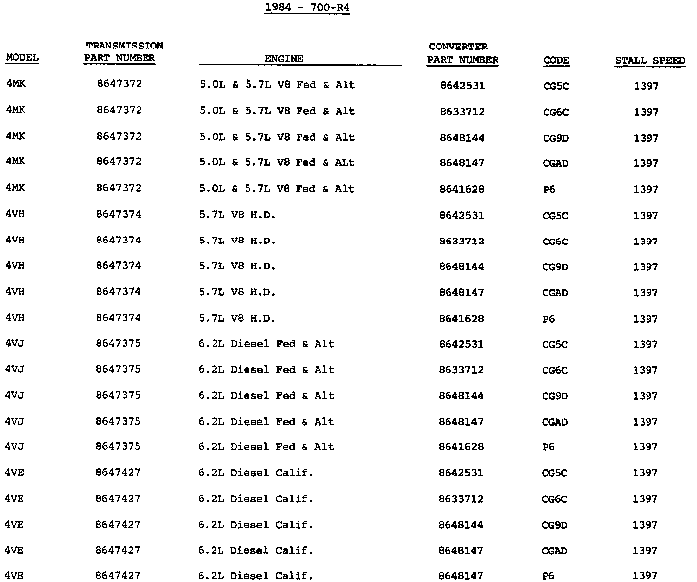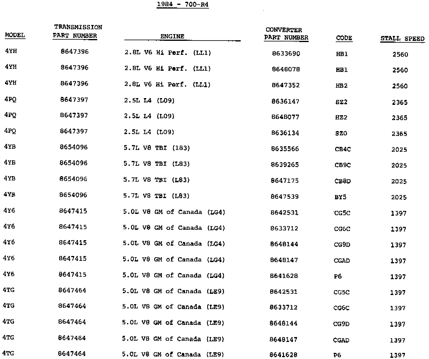 The following information is provided for 1984 model transmissions. It will enable you to identify some models and converter usage.