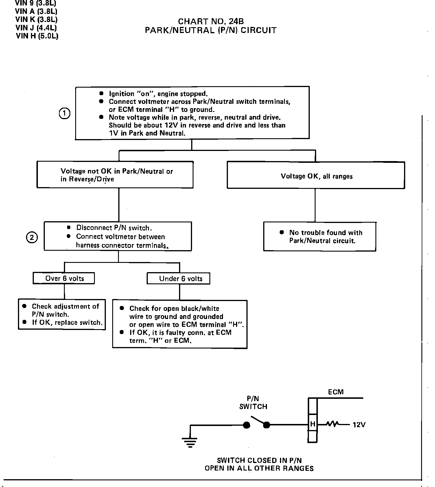 1. Checks for good P/N circuit. When the switch is closed in Park and Neutral, the voltage across the P/N switch terminals should be low, usually less than 1 volt. When the switch is open in Drive and Reverse, the voltage should be about battery voltage.