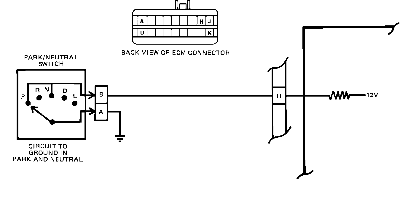 The P/N switch is connected to the transmission gear selector. The switch is closed when the gear selector is in Park or Neutral and open for all other ranges. One side of the switch is connected to the ECM which supplies a buffered 12 volts. The other side of the switch is connected to ground. The P/N switch is an input to the ECM. When the voltage at ECM Terminal "H" is high (12 volts), the ECM allows activation, at the proper time, of other controls such as TCC, EST, VSS, ISC and others.