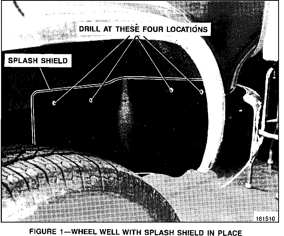 2. Position the splash shield (P/N 15685862) in the wheel-well opening as shown in figure 1. Using the splash shield as a template, mark the position of the four attaching holes.