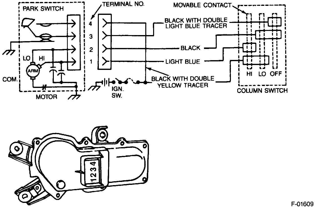 As shown, the base wiper motor has three brushes which are referred to as common, low speed and high speed. When the ignition switch is on, 12V plus circuit is completed to both the low and high speed fixed contacts in the column switch. The low and high speed brushes are connected to the column switch through terminals 2 and 1. The armature is grounded through the common brush via the ground strap.