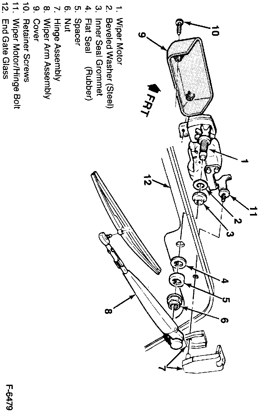 8. Wiper motor (1), inner seal grommet (3) and beveled washer (2) from the end gate glass (12).