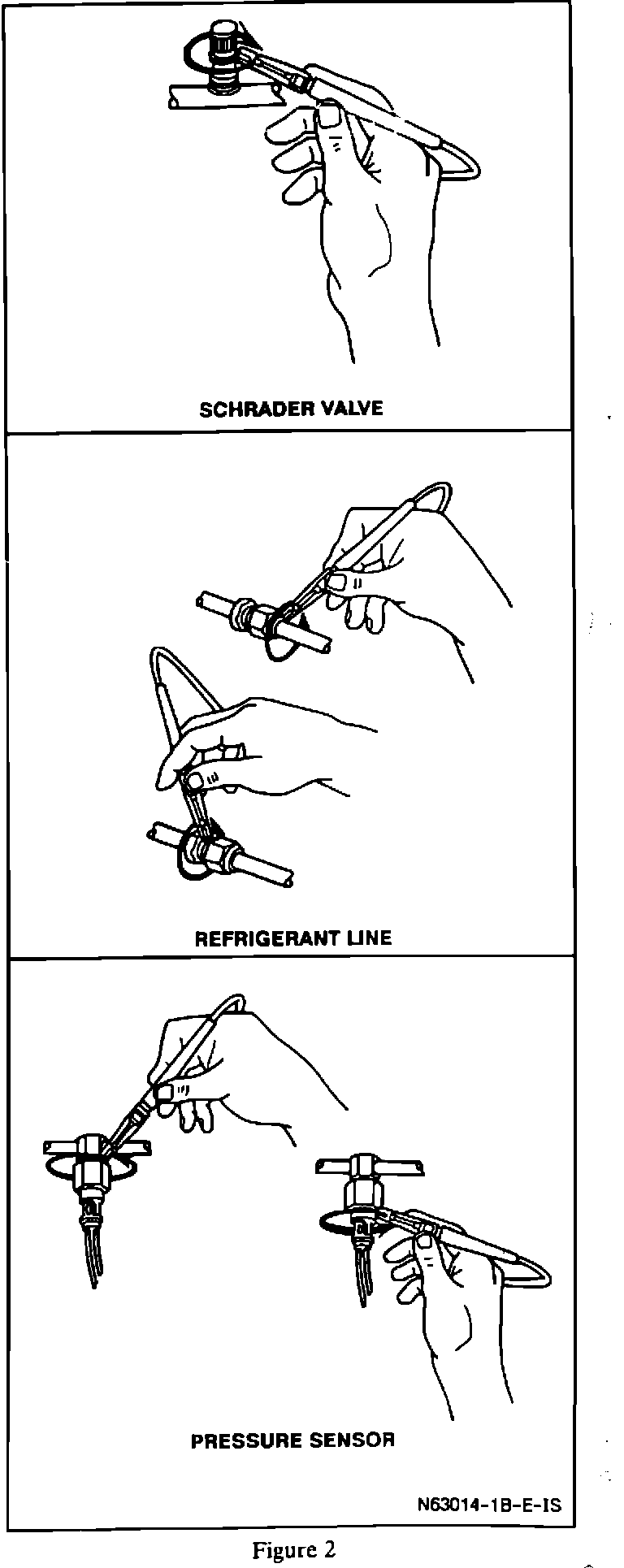 The most common leaks are found at the refrigerant fittings or connections. This may be caused by improper torque, damaged O-rings, lack of lubricant on the O-rings, or dirt/debris across the O-ring. Even the smallest piece of lint from cotton gloves or shop cloths can create a leak path across an O-ring. The successful use of this and any other electronic leak detector depends greatly upon the scan rate and upon carefully following the manufacturer's instructions regarding calibration, operation, and maintenance. Each joint niust be completely circled moving at 1-2 inches per second with the tip of the probe as close to the surface as possible but no more than 1/4" away and without blocking air intake. A leak is indicated when the audible tone goes from a steady 1-2 clicks per second to a solid alarm. The balance knob should be adjusted frequently to maintain the 1-2 clicks per second rate.