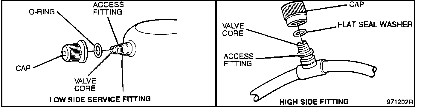 When servicing any vehicle's A/C system, make sure all access fitting cap seals (refer to Figure 1) are in place and tight. Caps should be threaded on until contact with the "O" ring seal is made and then tightened another 1/4 - 1/2 turn to ensure proper sealing.
