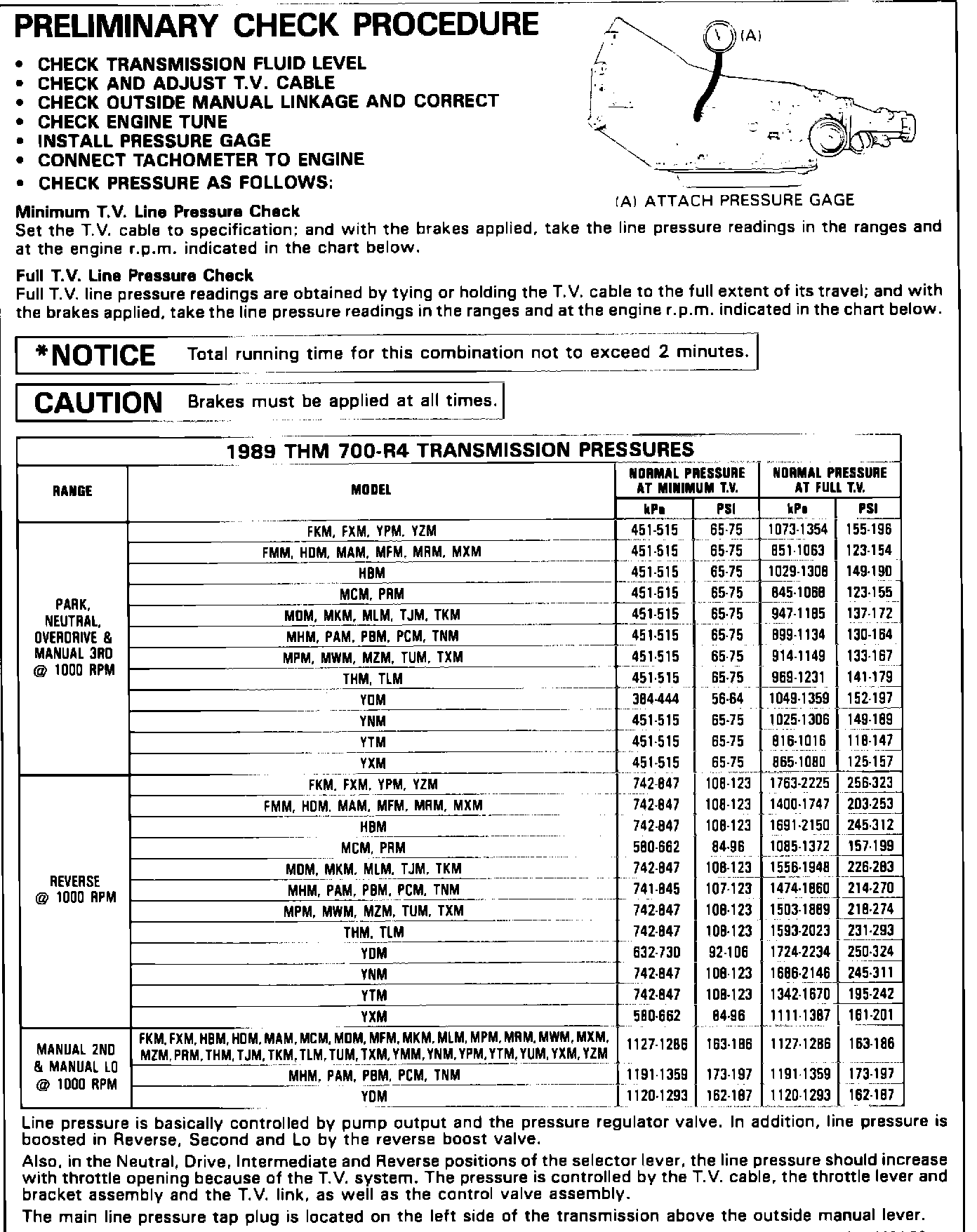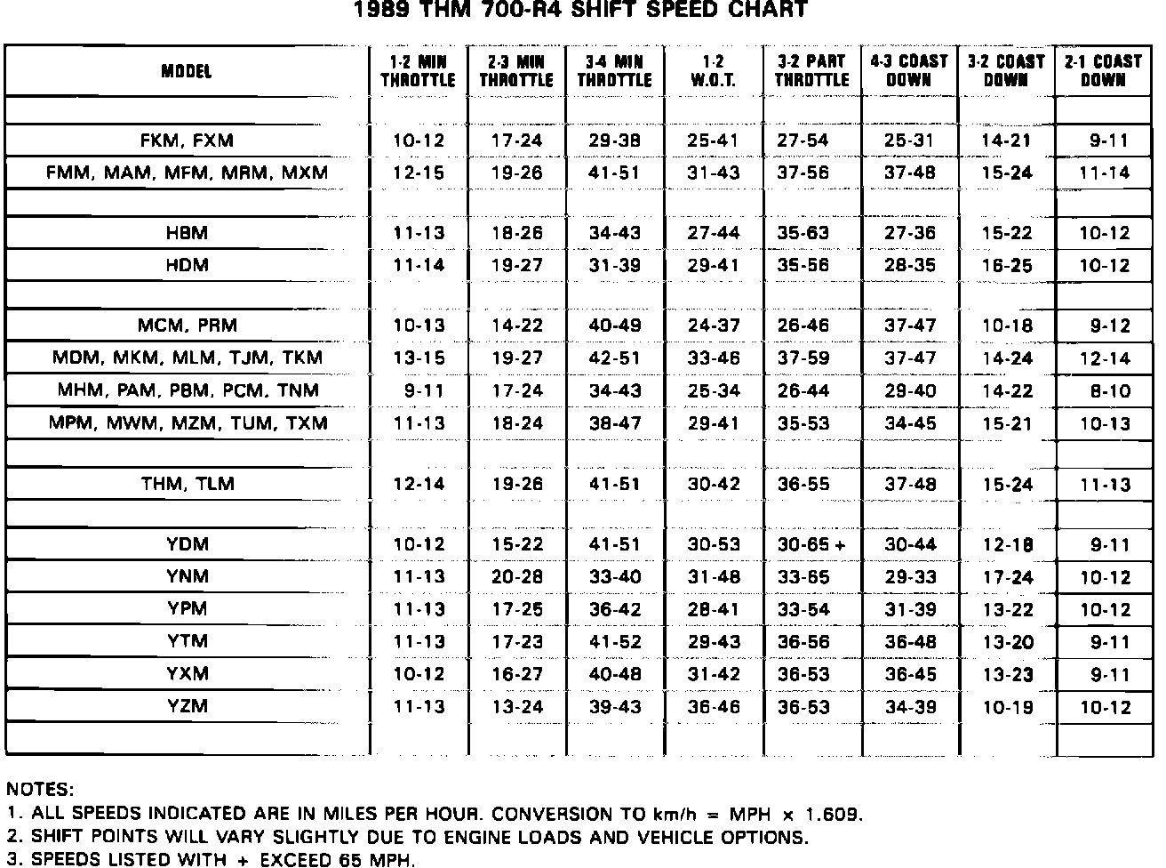 Service Manual Update - 1989 THM 700-R4 Shift Speed and Transmission Pressure Charts