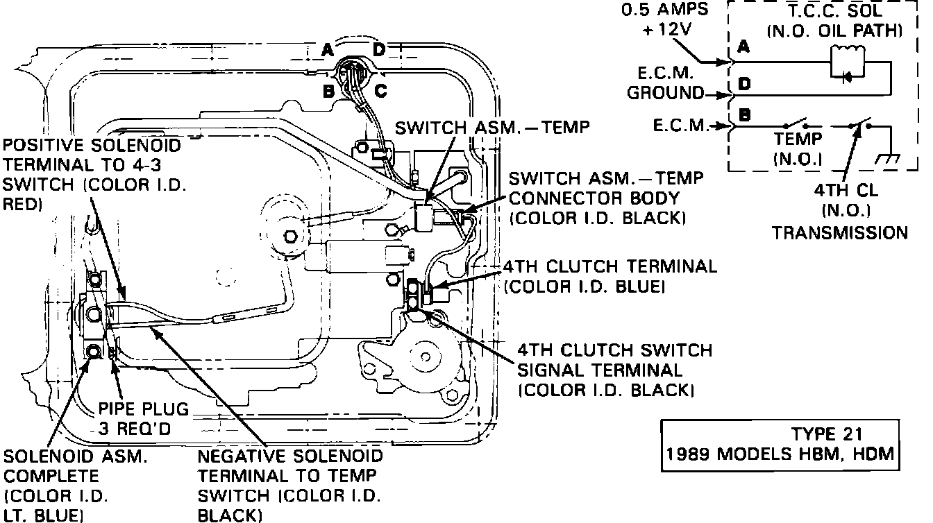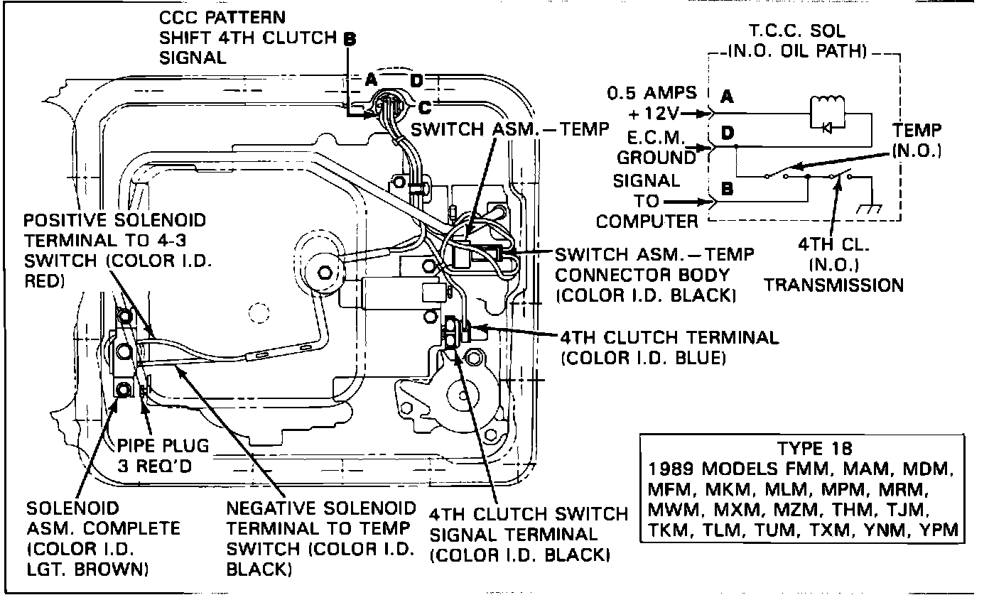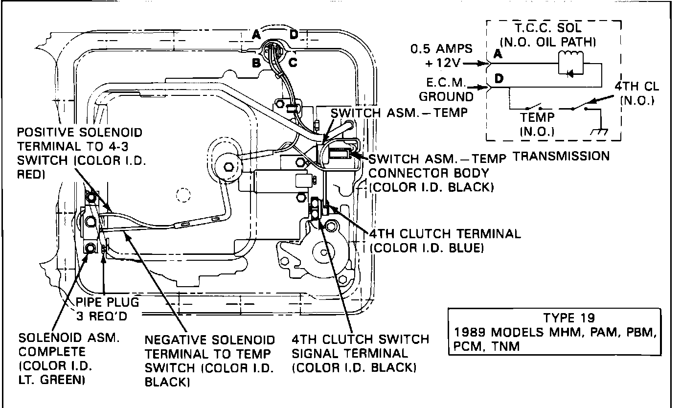 Beginning with the 1989 model year, the FMM model THM 700-R4 transmission uses a Type 18 Solenoid Assembly and Wiring Harness (refer to Figure 5). The Type 18 Solenoid Assembly and Wiring Harness was introduced late in the 1988 model year and replaced most Type 15 Solenoid Assembly production (reference GMC Truck Bulletin 89-T-03. The FMM model is the last Type 15 Solenoid Assembly model to change to Type 18 usage. Also for 1989 is the addition of two new solenoid assemblies, Type 19 Solenoid Assembly and Wiring Harness and Type 21 Solenoid Assembly and Wiring Harness (refer to Figures 5 and 7). Both the Type 19 and Type 21 Solenoid Assemblies were introduced on their respective models at 1989 start of production.