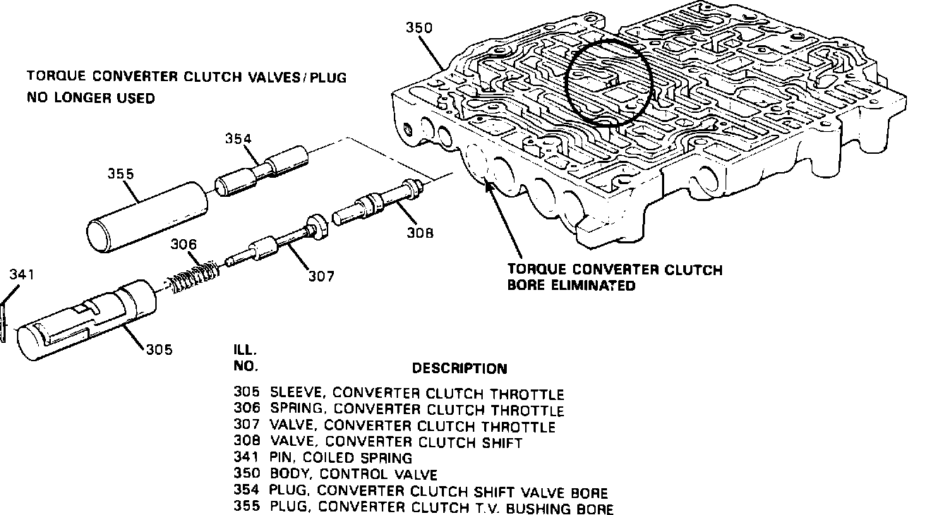 Service information for new THM 700- R4/HYDRA-MATIC 4L60 control valve assembles. The new control valve assembly will no longer have the TCC bore, and now contains a "notch" in the channeling allowing 2nd Clutch oil into the TCC circuit (refer to Figure No. 1). The TCC bore, in the past, has housed either the converter dutch throttle valve and sleeve or the converter clutch bore plug. The converter clutch throttle valve was used on models that had non-ECM controlled TCC apply. The converter clutch bore plug was used on models that had ECM controlled TCC apply. Starting with 1989 production, all THM 700-R4(HYDRA-MATIC 4L60 models are ECM controlled TCC apply. Since there are no current produdion models using the converter dutch throttle valve, the TCC bore is not . needed and has been elminated.