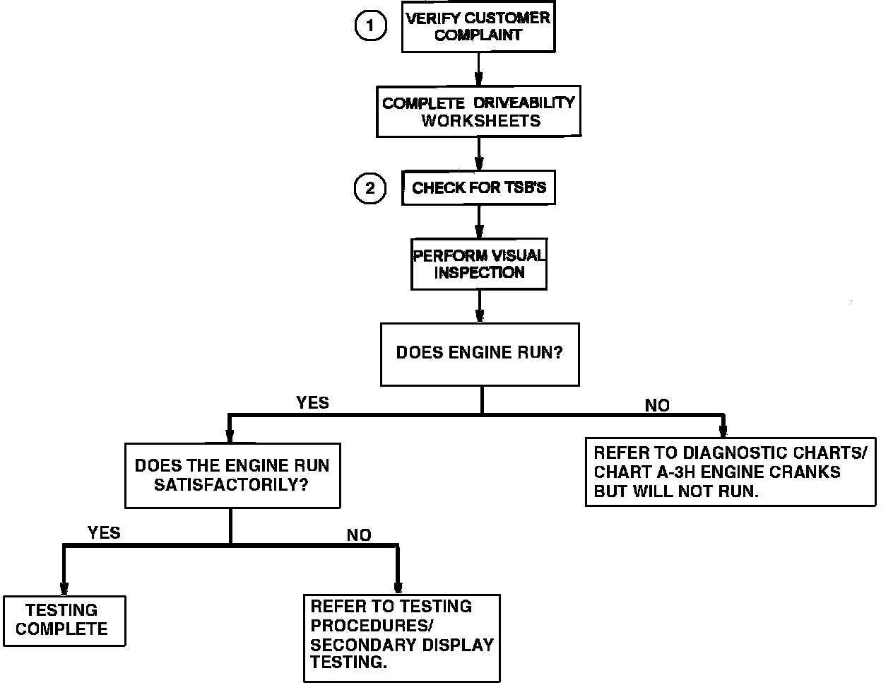 b. Since this is the starting point for all diagnostic procedures or finding the cause of an emissions test failure, always begin here and always follow the flow chart as directed.
