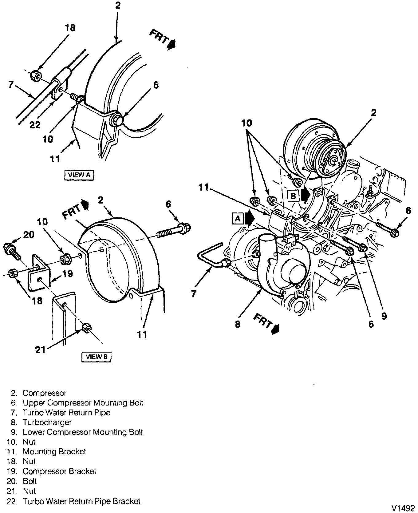 4. Turbo water return pipe bracket (22) onto upper compressor mounting bolt (6).