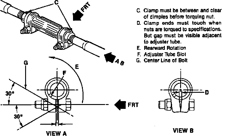 - To adjust, loosen clamp bolts at each end of steering tie rod adjustable sleeves.