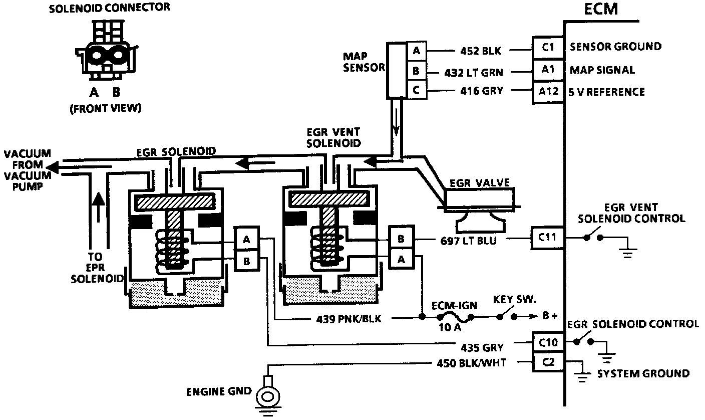The computer sends a 5 volt reference signal to the MAP sensor. As vacuum changes occur in the EGR supply line, the electrical resistance of the MAP sensor also changes. By monitoring the sensor output voltage, the computer can determine the EGR line vacuum.