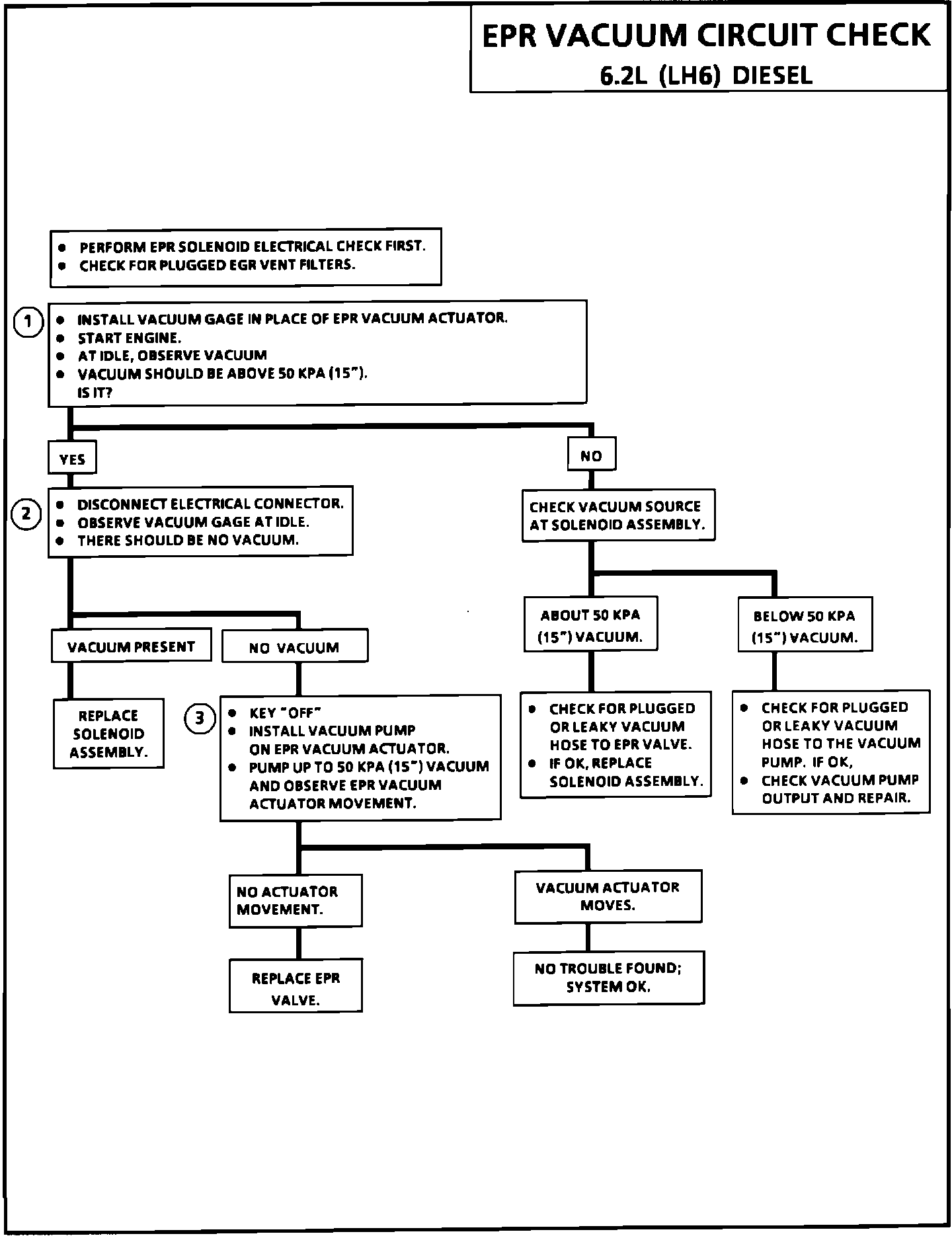 1. Checks for normal EPR vacuum at idle. Since electrical circuit was verified as OK on prior chart, if no vacuum is present, it is due to no source vacuum (vacuum pump) or a restriction or leak in vacuum lines to valve, including the solenoid.